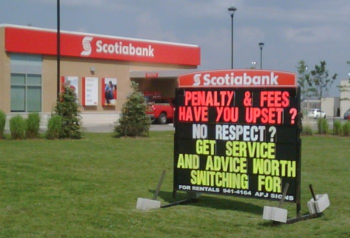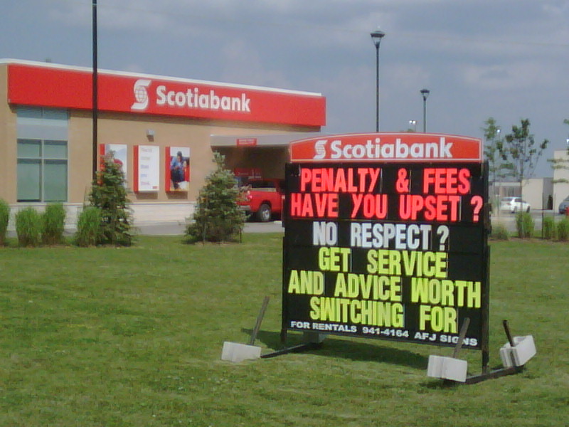 Last week someone sent me this mobile pic from just outside a Scotiabank branch.. We couldn’t help but find the ad amusing… In case you can’t read it.. “Penalty & fees have you upset? No respect? Get service and advice worth switching for”.…